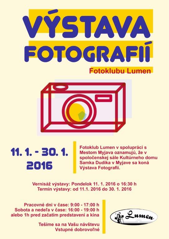 MYJAVA – Fotoklub Lumen a mesto Myjava vás srdečne pozývajú na výstavu fotografií, ktorá sa bude konať v spoločenskej sále Kultúrneho domu Samka Dudíka v Myjave. Začne sa vernisážou v pondelok 11. januára 2016 o 16.30 h a potrvá do soboty 30. januára. Verejnosti budú fotografie prístupné v pracovných dňoch od 9.00 do 17.00 h a počas víkendov od 16.00 do 19.00 h, respektíve jednu hodinu pred začatím premietania v kine Primáš alebo začiatkom kultúrneho podujatia. Príďte sa pozrieť, ste vítaní!