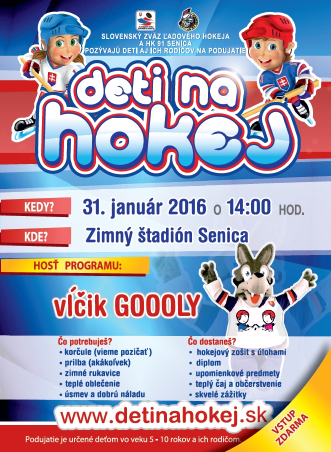 Slovenský zväz ľadového hokeja a HK 91 Senica pozývajú deti a ich rodičov na podujatie DETI NA HOKEJ, ktoré sa uskutoční 31. januára 2016 o 14.00 hod. na Zimnom štadióne v Senici. Hosťom programu bude aj maskot Vĺčik Goooly.