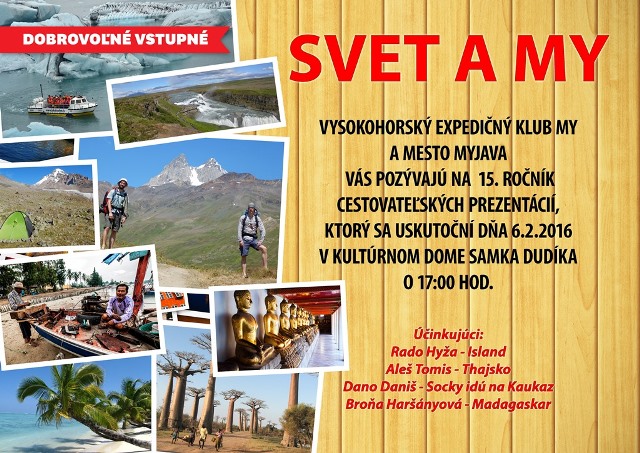 Mesto Myjava a Vysokohorský expedičný klub MY vás srdečne pozývajú na 15. ročník cestovateľských prezentácii s názvom SVET A MY, ktoré sa uskutočnia v sobotu 6. februára 2016 o 17.00 h v hlavnej sále Kultúrneho domu Samka Dudíka v Myjave. Pozrieť a vypočuť si budete môcť zážitky z ciest po Islande, Thajsku, Kaukaze a Madagaskare. Vstupné je dobrovoľné, všetci ste vítaní!