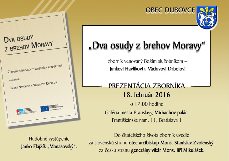 Podujatie – prezentácia zborníka „ Dva osudy z brehov Moravy“, venovaný Božím služobníkom – Jankovi Havlíkovi a Václavovi Drbolovi. V rámci podujatia bude mať hudobné vystúpenie náš priateľ Janko Flajžík „Maňašovský“, dekan.