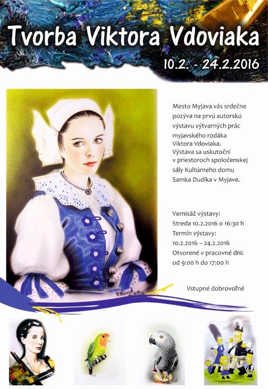 MYJAVA – Mesto Myjava vás srdečne pozýva na prvú autorskú výstavu myjavského výtvarníka Viktora Vdoviaka. Tá sa uskutoční vo februári v spoločenskej sále Kultúrneho domu Samka Dudíka v Myjave. Vernisáž je naplánovaná na stredu 10. februára 2016 o 16.30 h. Vystavené diela si budete môcť pozrieť počas dvoch týždňov, a to do stredy 24. februára 2016. Výstava bude prístupná vždy v pracovné dni od 9.00 do 17.00 h. Vstupné je dobrovoľné. Ste vítaní!