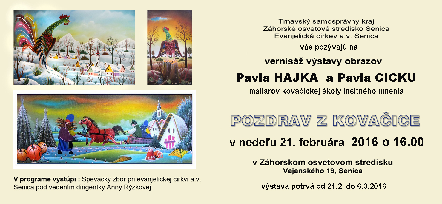 Záhorské osvetové stredisko Senica a Evanjelická cirkev a.v. Senica pozývajú na vernisáž výstavy obrazov  Pavla Hajka a Pavla Cicku s názvom Pozdrav z Kovačice. Výstavu týchto maliarov zo srbskej kovačickej školy insitného umenia si budete môcť pozrieť od nedele 21. februára, kedy sa o 16.00 hod. v ZOS Senica uskutoční vernisáž, do 6. marca 2016.