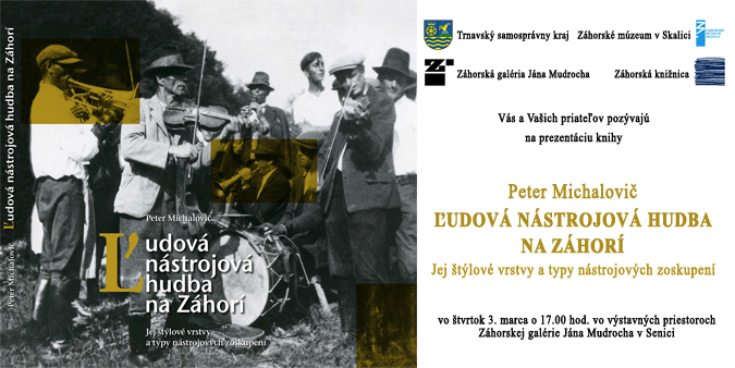 Záhorská galéria Jána Mudrocha a Záhorská knižnica Senica pozývajú na prezentáciu knihy Petra Michaloviča s názvom Ľudová nástrojová hudba na Záhorí – Jej štýlové vrstvy a typy nástrojových zoskupení, ktorá sa zaoberá ľudovou hudbou v záhorskom regióne s dôrazom na jej inštrumentálnu podobu. Prezentácia sa uskutoční vo štvrtok 3. marca o 17.00 hod. vo výstavných priestoroch Záhorskej galérie Jána Mudrocha.