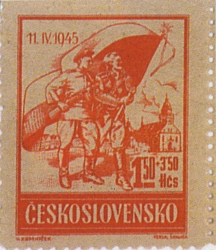 Porozprávam vám jej príbeh. Redaktor Československého rozhlasu Ján Vrábel pracoval v rokoch 1957 – 1960 v Československej redakcii sovietskeho rozhlasu v Moskve. Jedného dňa sa s reportérskym mikrofónom ocitol pri Čiernom mori v Odese. Tamojší redaktor Galickij ho z ničoho nič začal presvedčovať, že u nich v mestečku Krasnyje Okny žije ruský seržant, ktorého zvečnili na prvej československej známke, vydanej po oslobodení. Neveriaceho Janka predsa len uhovoril. Cestoval za seržantom, a skutočne u neho našiel fotografiu, na ktorej je on, Alexej Juraš so samopalom a vedľa neho československý vojak s pásom nábojov cez rameno, držiac československú zástavu. Hore na fotografii bol dátum 11. IV. 1945, pod obrázkom text – Československo 1.50-3.50 Kčs, ale aj obrysy kostola. Hneď poviem, skalického kostola.