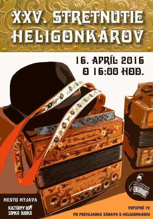 Sobota 16. apríla 2016 bude v Myjave opäť patriť heligónke. Majstri v hre na tento hudobný nástroj sa totiž už 25-krát zídu v Kultúrnom dome Samka Dudíka, aby prítomným divákom predviedli svoje umenie. Obľúbené podujatie sa začne o 16.00 h a po ňom bude – už tradične – nasledovať zábava s heligonkármi. Vstupenky na XXV. stretnutie heligonkárov v hodnote 7,- € si môžete zakúpiť v kancelárii kultúrneho domu alebo online na portáli www.kultura.myjava.sk. Srdečne vás na túto akciu pozývame!