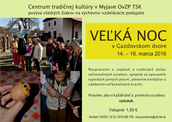 Centrum tradičnej kultúry v Myjave (ďalej CTK Myjava) srdečne pozýva všetky deti, školákov a ich pedagógov na interaktívne podujatie ľudovej kultúry s názvom Veľká noc v Gazdovskom dvore. Rozprávanie o zvykoch a tradíciách počas veľkonočných sviatkov spojené so spevom, pletením korbáčov či zdobením kraslíc sa bude v Gazdovskom dvore v myjavskej mestskej časti Turá Lúka konať v termíne od 14. do 18. marca 2016. Vstupné je 1,50 € a záujemcovia sa môžu na podujatie prihlásiť priamo v CTK Myjava na číslach 034/621 32 52, 0918 968 706 alebo mailom na adrese livia.grznarova@ctk.tsk.sk. Ste vítaní!