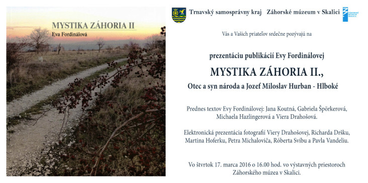 V Záhorskom múzeu v Skalici sa uskutoční prezentácia publikácií Evy Fordinálovej Mystika Záhoria II., Otec a syn národa. Vzťah Jána Hollého a Ľudovíta Štúra a Jozef Miloslav Hurban – Hlboké, ktoré vydalo Záhorské múzeum v roku 2015.