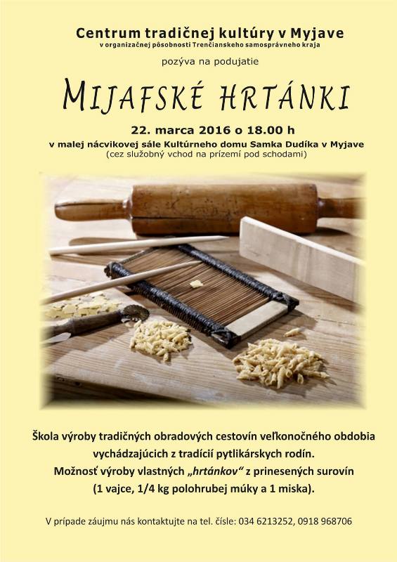 Centrum tradičnej kultúry v Myjave vás srdečne pozýva na školu výroby hrtánkov – tradičných veľkonočných obradových cestovín pytlikárskych rodín. Škola sa bude konať v malej nácvikovej sále Kultúrneho domu Samka Dudíka v utorok 22. marca 2016 o 18.00 h. Treba si priniesť vlastné suroviny podľa pokynov na priloženom plagáte. Zároveň tu bude možnosť zakúpiť si formu na výrobu vlastných hrtánkov. V prípade záujmu môžete kontaktovať Centrum tradičnej kultúry v Myjave na tel. číslach 034/621 32 53, 0918 968 706.