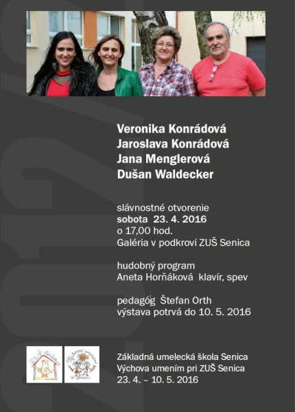 Základná umelecká škola Senica a Výchova umením pri ZUŠ Senica pozývajú na slávnostné otvorenie výstavy žiakov Štúdia pre dospelých 2012 – 2016 Veroniky Konrádovej, Jaroslavy Konrádovej, Jany Menglerovej a Dušana Waldeckera, ktoré sa uskutoční v sobotu 23. apríla o 17.00 hod. v Galérii v podkroví ZUŠ Senica.