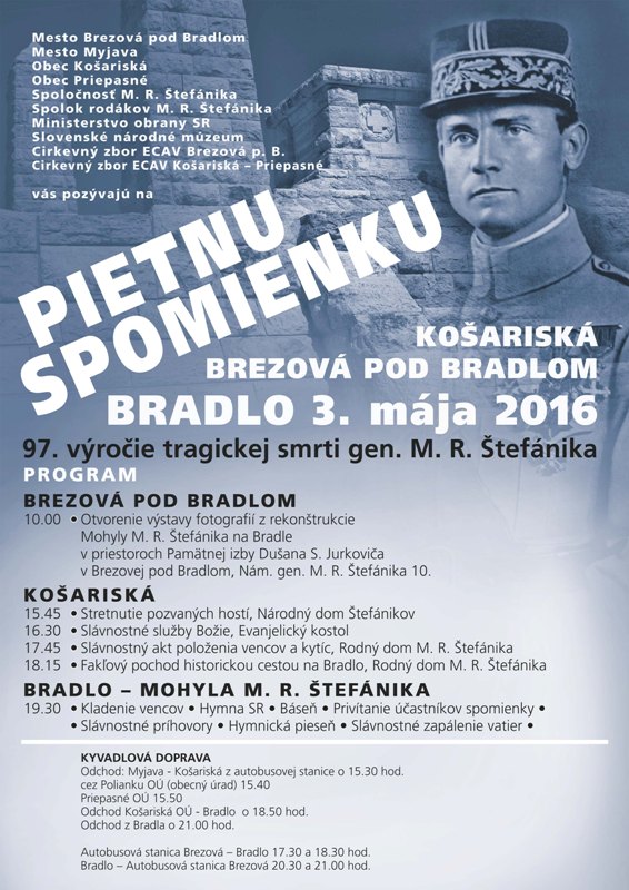 Múzeum Slovenských národných rád v Myjave a Múzeum M. R. Štefánika v Košariskách, v spolupráci s mestom Brezová pod Bradlom a mestom Myjava, obcou Priepasné a obcou Košariská, Spoločnosťou M. R. Štefánika, Spolkom rodákov M. R. Štefánika, Ministerstvom obrany SR, cirkevným zborom ECAV Brezová pod Bradlom a cirkevným zborom ECAV Košariská – Priepasné vás pozývajú na Pietnu spomienku pri príležitosti 97. výročia tragickej smrti gen. M. R. Štefánika, ktorá bude v utorok 3.mája 2016.