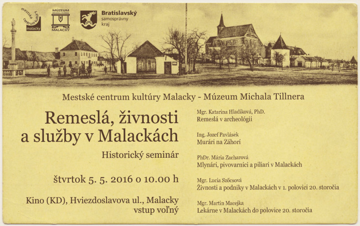 Vo štvrtok 5. mája predstavia v kine na Hviezdoslavovej ulici v Malackách počas semináru históriu remesiel, živností a služieb v Malackách historici, archeologička a stavebný inžinier. Od 10:00 sa teda miestni, ale aj návštevníci Malaciek, môžu dozvedieť o remeslách v archeológii, ktoré predstaví Mgr. Katarína Hladíková, PhD. Ďalšiu prednášku o murároch na Záhorí povedie Ing. Jozef Pavlásek, mlynárov, pivovarníkov a piliarov v Malackách predstaví historička PhDr. Mária Zacharová a o živnostiach a podnikoch v Malackách v 1. Polovici 20. Storočia porozpráva Mgr. Lucia Szöcsová. Seminár uzavrie prednáškou Lekárne v Malackách do polovice 20. Storočia Mgr. Martin Macejka.