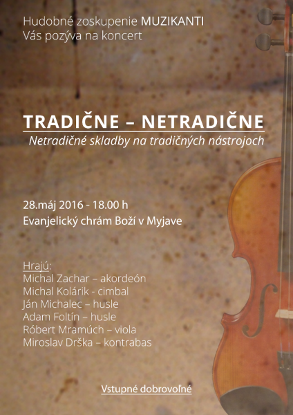 Hudobné zoskupenie MUZIKANTI Vás pozýva na koncert s názvom TRADIČNE – NETRADIČNE, ktorý sa uskutoční v sobotu 28. mája o 18.00 h v Evanjelickom chráme Božom v Myjave. Novovzniknuté hudobné teleso tvoria členovia rôznych ľudových hudieb z myjavských kopaníc: Michal Zachar – akordeón, Michal Kolárik – cimbal, Ján Michalec – husle, Adam Foltín – husle, Róbert Mramúch – viola, Miroslav Drška – kontrabas. Počas koncertu zaznejú skladby rôznych žánrov od rôznych autorov na tradičných ľudových nástrojoch. Príďte si vypočuť „fajnovú muziku“ a spríjemniť si tak sobotný podvečer. Ste srdečne vítaní!