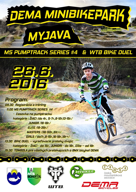 V nedeľu 26. júna 2016 sa v bikrosovom areáli DEMA Mini Bike Park na Novomestskej ulici v Myjave uskutočnia preteky MS Pumptrack Series určené všetkým kategóriám pretekárov. Registrácia účastníkov sa začne o 9.30 h , prví jazdci vyjdú na trať o 11.00 h. Súťažiť budú v dvoch disciplínach – v časovke na pumptracku a vo WTB bike dueli. Ukončenie pretekov je naplánované na 15.30 h a ich súčasťou bude aj tombola, v ktorej môžu pretekári vyhrať napríklad BMX bicykel Dema Hornet v hodnote viac ako 250,- €. Srdečne vás na podujatie pozývame, príďte povzbudiť najmä členov bikrosového oddielu Spartaka Myjava!