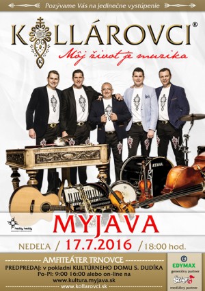 Mesto Myjava vás srdečne pozýva na koncert kapely Kollárovci s názvom Môj život je muzika. Ten sa uskutoční v amfiteátri Trnovce v nedeľu 17. júla 2016 o 18.00 h. Lístky v hodnote 8,- € si môžete zakúpiť v predpredaji v kancelárií Kultúrneho domu Samka Dudíka alebo online na stránke http://www.kultura.myjava.sk/. V deň koncertu sa budú vstupenky predávať za cenu 10,- €. Srdečne vás na koncert pozývame!