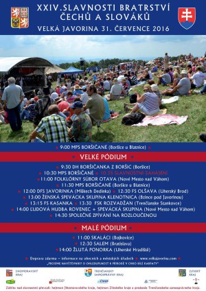 Posledný júlový víkend bude na Veľkej Javorine patriť už 24. ročníku Slávností bratstva Čechov a Slovákov. Najskôr sa v sobotu 30. júla o 14.00 h na najvyššom vrchu Bielych Karpát stretnú cykloturistickí patrioti v rámci Javorina Tour a o deň neskôr sa začne hlavný program slávností. Nedeľu otvorí už tradične položenie kytíc k pamätníku naplánované na 9.00 h a po ňom sa rozbehnú kultúrne programy na malom i veľkom pódiu. Návštevníci slávností usporadúvaných pod záštitou Trenčianskeho, Jihomoravského a Zlínskeho kraja sa môžu tešiť na vystúpenia folklórnych súborov, ľudových hudieb, dychoviek i country skupín z oboch strán hranice, ktorých rozpis nájdete na plagáte.