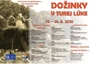 O 10.30 h sa začne pásmo nazvané Kosí Jano, mláti Palo, v ktorom miestni folkloristi predvedú divákom tradičnú žatvu a ukážky ďalších poľných prác tak, ako sa kedysi robili. Nebudú chýbať ani súťaž v kosení, detské tvorivé dielne, škola spevu a tanca s FS Otava či sprievodný kultúrny program. O Gurmánske hody sa postarajú poľovníci. Od 14.30 h je do programu zaradená príprava dožinkových vencov a následný dožinkový sprievod Turou Lúkou, ktorý bude končiť v Gazdovskom dvore. Tu bude nasledovať tradičné pohostenie po žatve a dožinkové posedenie. O 19.00 h sa v Padelkoch začne Dožinková zábava s ľudovou hudbou Šramel. Tohoročné dožinky budú oficiálne ukončené v nedeľu 14. augusta 2016 slávnostnými Službami Božími v turolúckom evanjelickom kostole so začiatkom o 9.30 h. Všetkých vás srdečne na toto podujatie pozývame!