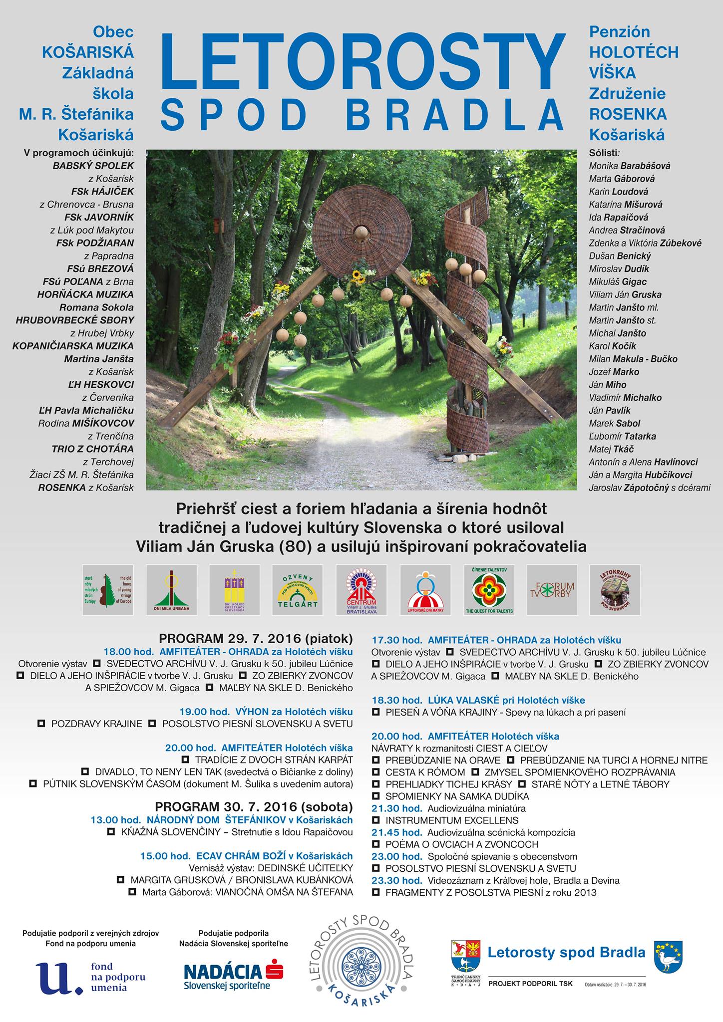 V dňoch 29. a 30. júla 2016 sa v obci Košariská uskutoční ďalší ročník zaujímavého podujatia nazvaný Letorosty spod Bradla. Pripravili ho obec Košariská, Základná škola M. R. Štefánika v Košariskách, penzión Holotéch Víška a Združenie Rosenka Košariská. Počas dvoch dní si tu budete môcť pozrieť viac ako 20 programov v podaní štrnástich folklórnych súborov a skupín a vyše dvadsiatky sólistov, medzi ktorými nájdeme napríklad aj Miroslava Dudíka či Idu Rapaičovú. Pripravené sú výstavy, koncerty, divadlá i audiovizuálne pásma. Letorosty spod Bradla podporili aj Trenčiansky samosprávny kraj a Fond na podporu umenia. Srdečne vás na program pozývame!