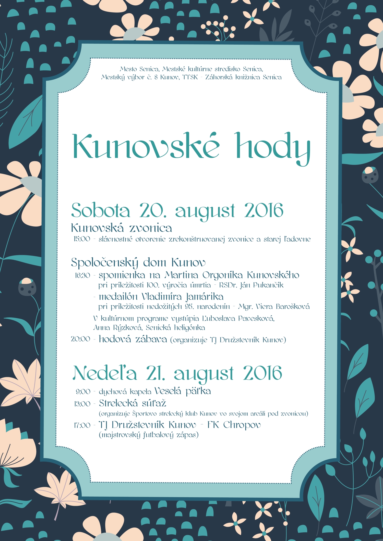16.30 Spomienka na kunovských rodákov Martina Orgoníka Kunovského pri 100. výročí úmrtia a historika Vladimíra Jamárika pri 95. výročí narodenia.