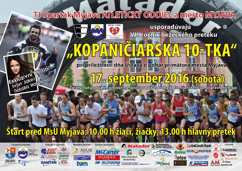 V sobotu 17. septembra 2016 v sobotu sa na Myjave uskutoční 7. ročník bežeckých pretekov o pohár primátora s názvom Kopaničiarska desiatka, ktoré sa budú konať pri príležitosti Dňa Ústavy. Podujatie pripravuje Atletický oddiel TJ Spartak Myjava a mesto Myjava. V dopoludňajších hodinách sa uskutočnia behy žiakov a žiačok so štartom o 10.00 h pri mestskom úrade. Centrum mesta bude vtedy pre dopravu uzavreté. Tohoročnou novinkou týchto žiackych behov sú nové kategórie. Zvlášť pobežia žiaci a žiačky 1. a 2. ročníka a zvlášť žiaci a žiačky 3. a 4. ročníka. Trať bude dlhá 300 m. Trať dlhú 600 m potom pobežia žiaci a žiačky II. stupňa základných škôl. Prezentácia pretekárov sa začne o 9.00 h pri Mestskom úrade v Myjave. Každý účastník dostane malé občerstvenie a účastnícku medailu. Víťazi v kategóriách žiačky a žiaci získajú na prvých troch miestach hodnotné vecné ceny, medaile a celkoví víťazi aj poháre.