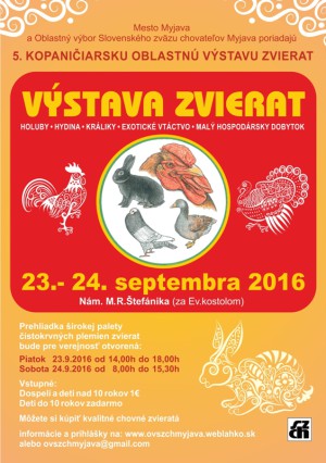 V posledných rokoch sa stalo zvykom, že počas jesenného Michalského jarmoku sa na ploche pri evanjelickom kostole v Myjave koná aj Kopaničiarska oblastná výstava zvierat. Nebude to inak ani teraz a na 5. ročníku výstavy si v piatok 23. a v sobotu 24. septembra 2016 budete môcť pozrieť širokú paletu čistokrvných plemien zvierat – holuby, hydinu, králiky, malý hospodársky dobytok, exotické vtáctvo. Kvalitné chovné zvieratá sa tu budú dať aj kúpiť. Výstava bude otvorená v piatok od 14.00 do 18.00 h a v sobotu od 8.00 do 15.30 h. Vstupné je 1,- e pre dospelých a deti nad 10 rokov, mladšie ročníky majú vstup voľný. Informácie o podujatí a prihlášky nájdete na stránke www.ovszchmyjava.weblahko.sk.