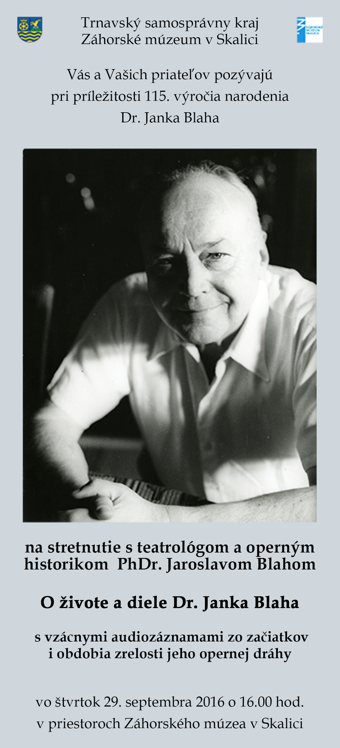 V roku 2016 si pripomíname 115. výročie narodenia národného umelca a prvého slovenského profesionálneho operného speváka Dr. Janka Blaha. Pri tejto príležitosti pripravilo TTSK – Záhorského múzeum v Skalici podujatie O živote a diele Dr. Janka Blaha – stretnutie s teatrológom a divadelným kritikom PhDr. Jaroslavom Blahom, synovcom Dr. Blaha, ktorý porozpráva o živote a diele významného umelca. Súčasťou stretnutia bude i uvedenie vzácnych audiozáznamov zo začiatkov i obdobia zrelosti jeho opernej dráhy.