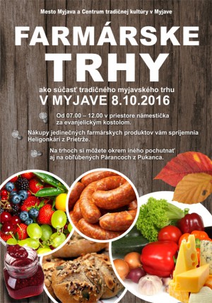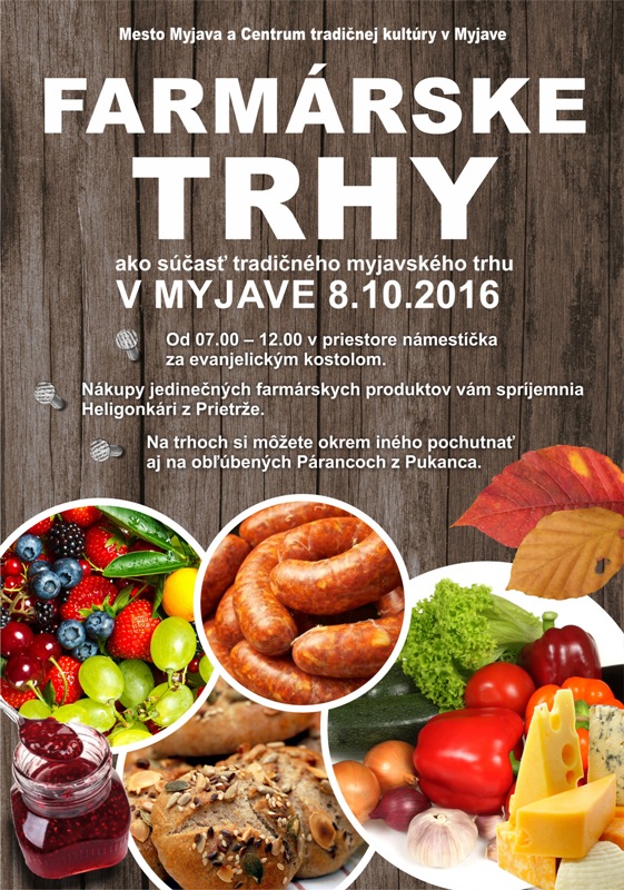 Mesto Myjava a Centrum tradičnej kultúry Myjava vás srdečne pozývajú na jesenné Farmárske trhy, ktoré sa ako súčasť tradičného myjavského trhu uskutočnia v sobotu 8. októbra 2016. Začnú sa o 7.00 h a potrvajú do 12.00 h. Predajné stánky – kopaničiarske domčeky budú situované v priestore pri evanjelickom kostole. Nákupy jedinečných farmárskych produktov vám počas dopoludnia spríjemnia Heligonkári z Prietrže a nebudú chýbať ani obľúbené párance z Pukanca. Radi vás v sobotu dopoludnia na trhoch uvidíme!