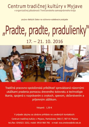 Centrum tradičnej kultúry Myjava pripravilo v Gazdovskom dvore v mestskej časti Turá Lúka ďalšie interaktívne podujatie tradičnej ľudovej kultúry pre žiakov. To nesie názov Pradte, pradte, pradulienky a je zamerané na ukážku pracovno-spoločenskej udalosti, akou priadky kedysi boli. Návštevníci tu do 17. do 21. októbra 2016 uvidia ukážky pradenia na drevenom kolovrate, technológiu tkania, budú si môcť vypočuť rozprávania o ľudových zvykoch, učiť sa piesne a nebude chýbať ani občerstvenie. Vstupné na toto výchovno-vzdelávacie podujatie je 1,50 € a školy sa môžu v prípade záujmu hlásiť v Centre tradičnej kultúry Myjava na partizánskej ulici v Myjave, tel.: 034/621 3252, 0918 968 706, e-mail: eva.cmelova@ctk.tsk.sk.