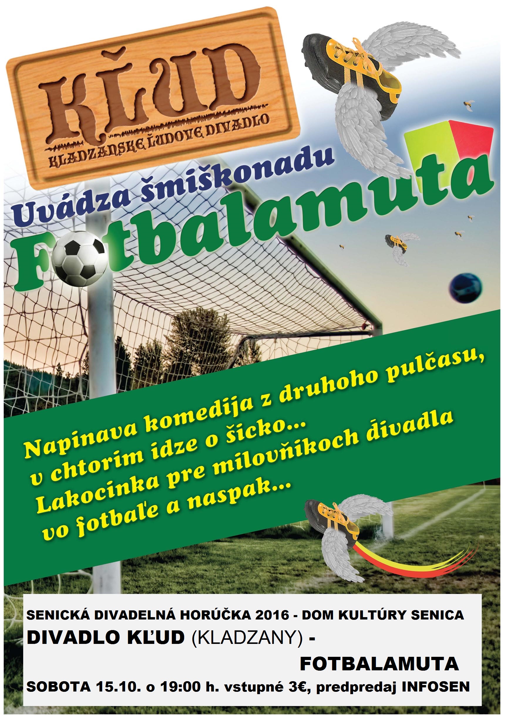 Senická divadelná horúčka v sobotu pokračuje aj druhým predstavením o 19.00 hod. s názvom FOTBALAMUTA. Na doskách Domu kultúry Senica sa s týmto predstavením uvedie Divadlo KĽUD Kladzany.  Príďte si pozrieť napínavú dedinskú futbalovú komédiu z druhého polčasu, v ktorej ide o všetko…