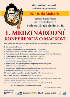 Kdo to byl Macek? Kedy a odkád išel do Malacek? Proč išel mlácit šošovicu akorát k nám? Co na to jeho žena? Nebylo to šecko konc ináč? – aj na tieto zásadné otázky našej súčasnosti sa pokúsi nájsť odpoveď 1. medzinárodná konferencia o Mackovi, ktorá sa uskutoční už v sobotu 15. októbra v kine (Kultúrním domčeku) od 10. hodiny.