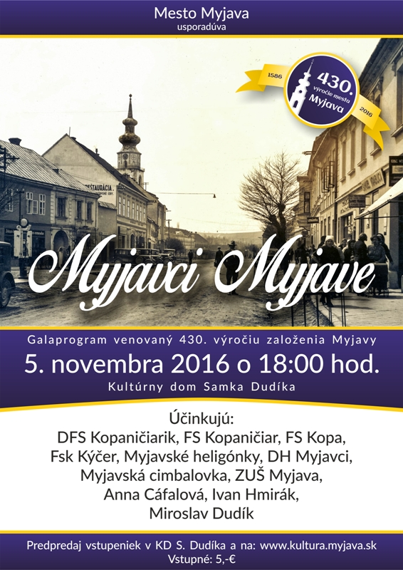 V sobotu 5. novembra 2016 sa v Kultúrnom dome Samka Dudíka v Myjave uskutoční galaprogram s názvom Myjavci Myjave venovaný 430. výročiu založenia Myjavy, ktoré si „metropola pod slamou“ v tomto roku pripomína. Začne sa o 19.00 h a predstavia sa v ňom DFS Kopaničiarik, FS Kopaničiar, FSK Kopa, FSk Kýčer, Myjavské heligónky, Dychová hudba Myjavci, Myjavská cimbalovka, Základná umelecká škola Myjava, Anna Cáfalová, Ivan Hmirák a Miroslav Dudík. Vstupenky na program v hodnote 5,- € si môžete kúpiť v predpredaji v kancelárií kultúrneho domu alebo online na portáli www.kultura.myjava.sk. Všetkých vás srdečne pozývame!