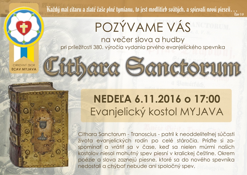 Cirkevný zbor ECAV Myjava vás srdečne pozýva na večer slova a hudby s názvom Cithara Sanctorum, ktorý sa bude konať pri príležitosti 380. výročia vydania prvého evanjelického spevníka. Cithara Sanctorum – Tranoscius – patril vždy k neoddeliteľnej súčasti života evanjelických rodín po celé stáročia. Preto členovia zboru pripravili túto akciu, prostredníctvom ktorej sa budete môcť vrátiť v čase a zažiť, ako to vyzeralo, keď sa v kostoloch ozýval mohutný spev piesní v kralickej češtine. Podujatie sa bude konať v nedeľu 6. novembra 2016 o 17.00 h v evanjelickom kostole v Myjave.
