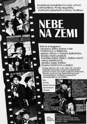 Senická divadelná horúčka bude pokračovať ďalším divadelným predstavením vo štvrtok 17. 11. 2016 o 19.00 hod., a to hudobnou komédiou Divadla oProti s názvom Nebe na zemi. Ide o komédiu s atmosférou Prvej republiky, známymi piesňami a živou hudbou.  Známe piesne z 30. a 40. rokov 20. storočia dopĺňajú komickými vstupmi profesionálni speváci a herci Ján Hyža a Katarína Petrusová.