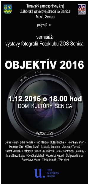 Fotografi združení vo Fotoklube ZOS Senica pozývajú na vernisáž výstavy fotografií s názom OBJEKTÍV 2016, ktorá sa uskutoční vo štvrtok 1. 12. 2016 o 18.00 hod. v Dome kultúry Senica.