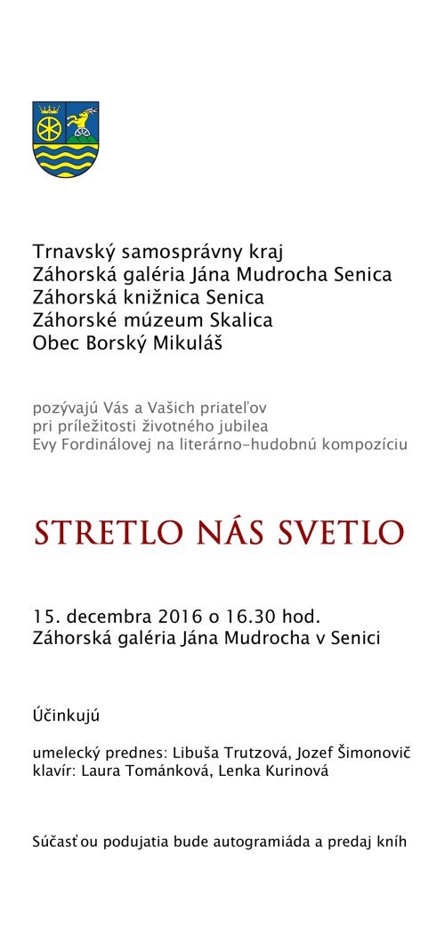 Pri príležitosti životného jubilea Evy Fordinálovej Vás pozývame na literárno–hudobný večer Stretlo nás svetlo, ktorý sa uskutoční 15. decembra o 16.30 hod. v Záhorskej galérii J. Mudrocha v Senici. Súčasťou podujatia bude autogramiáda a predaj kníh.