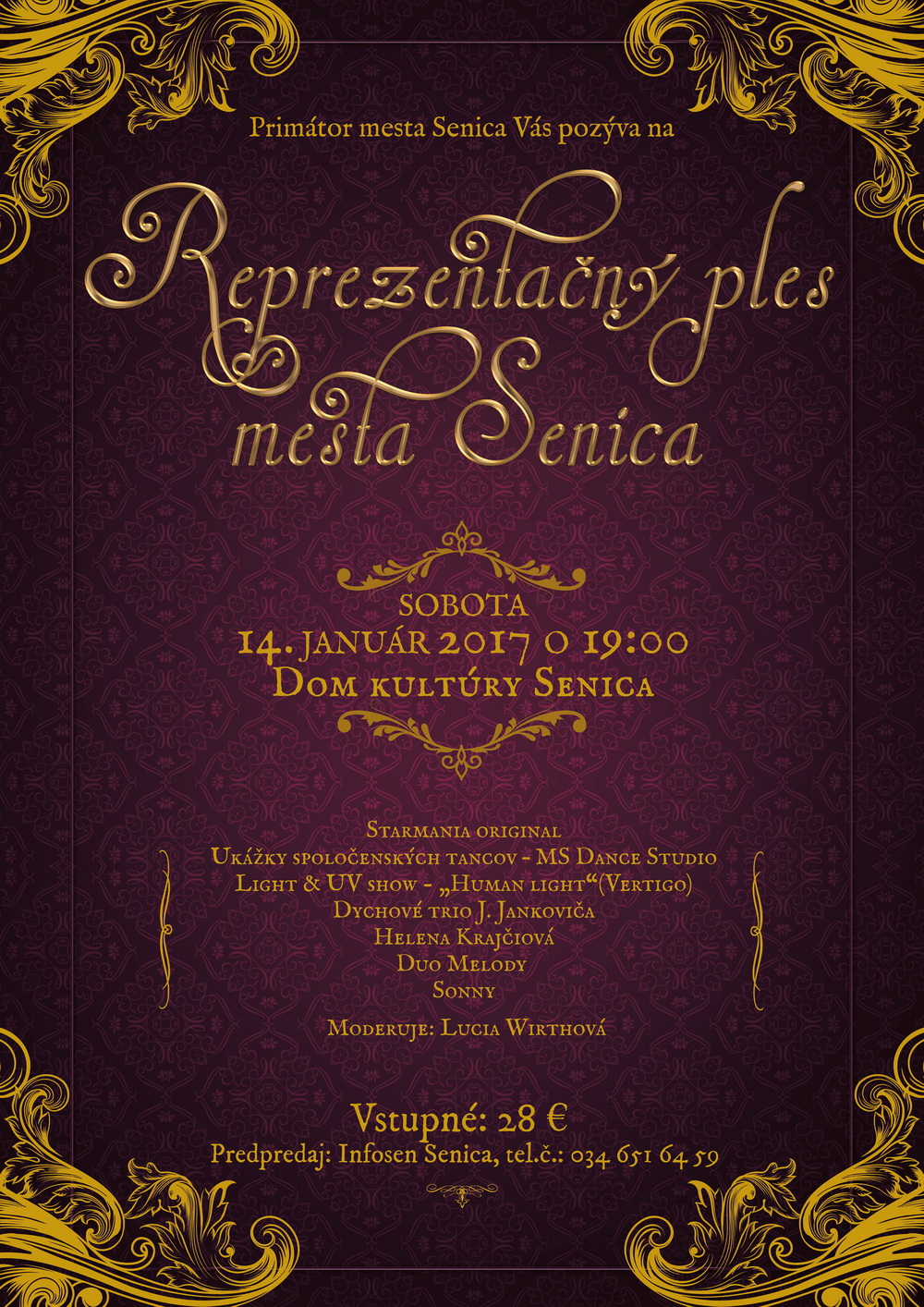Srdečne Vás pozývame na otvorenie plesovej sezóny v našom meste. Už túto sobotu 14. januára o 19.00 hod. ju v Dome kultúry Senica otvorí Reprezentačný ples mesta. Príďte si zatancovať a zabaviť sa pri: STARMANIA ORIGINAL, Ukážky spoločenských tancov – MS Dance Studio, Light & UV show – „Human light“ (Vertigo), Dychové trio J. Jankoviča, Helena Krajčiová, Duo Melody, Sonny.