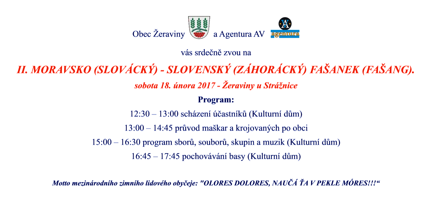 ŽERAVINY – MORAVA . Hudba, tanec a slivovica. Takto to v bude v  sobotu (18. 2.) vyzerať v malej dedinke Žeraviny na Morave. Koná sa tam 2. Medzinárodný Slovácko – Záhorácky fašang. Na ňom Záhoráci a Moraváci ukážu, ako sa vedia baviť. „Nápad na tento fašang vznikol na Vianoce, keď sme si povedali, že u nás v dedine nie je žiadna kultúra. Pochádzam zo Slovenska, tak preto sme zorganizovali Slovácko – Záhorácký fašank – fašang. Myšlienku podporil a do sveta spropagoval folklorista Antonín Vrba, ktorý je kmotrom fašanku. Myslím si, že akcia vďaka všetkým účinkujícím zo Záhoria a Slovácka sa podarila na výbornú”, povedala starostka obce Žeraviny, Ľubomíra Vařechová.