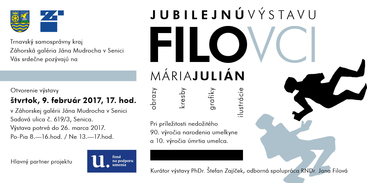 Záhorská galéria Jána Mudrocha v Senici usporiada v čase od 9. februára do 26. marca 2017 jubilejnú výstavu už nežijúcej bratislavskej manželskej dvojice výtvarníkov Márie a Juliána Filovcov k nedožitému 90. výročiu narodenia umelkyne a 10. výročiu úmrtia umelca. Vernisáž výstavy sa uskuoční 9. februára o 17.00 hod v Záhroskej galérii Jána Mudrocha v Senici.