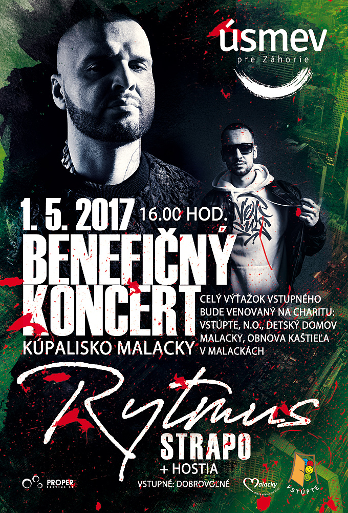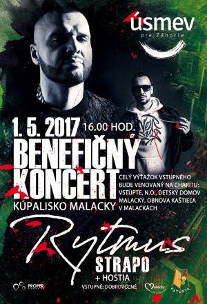 MALACKY 12. apríla 2017 – Populárny slovenský raper Patrik „Rytmus“ Vrbovský rozospieva Malacky už prvého mája na miestnom kúpalisku. Okrem obľúbeného speváka sa na pódiu predstavia aj súčasné hviezdy ako Strapo, DJ Euro a DJ Miss Rodez. Benefičný koncert organizuje občianske združenie Úsmev pre Záhorie a výťažok z dobrovoľného vstupného poputuje na dobrú vec.