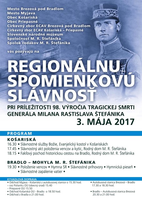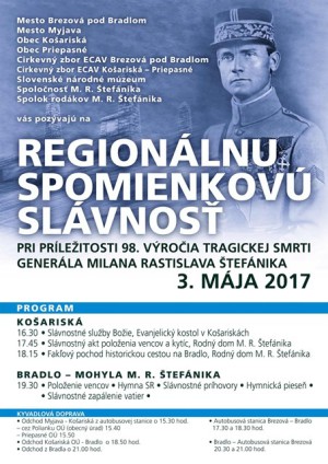 V stredu 3. mája 2017 sa bude v obci Košariská a na mohyle na Bradle konať regionálna pietna spomienka pri príležitosti 98. výročia tragického úmrtia gen. M. R. Štefánika.