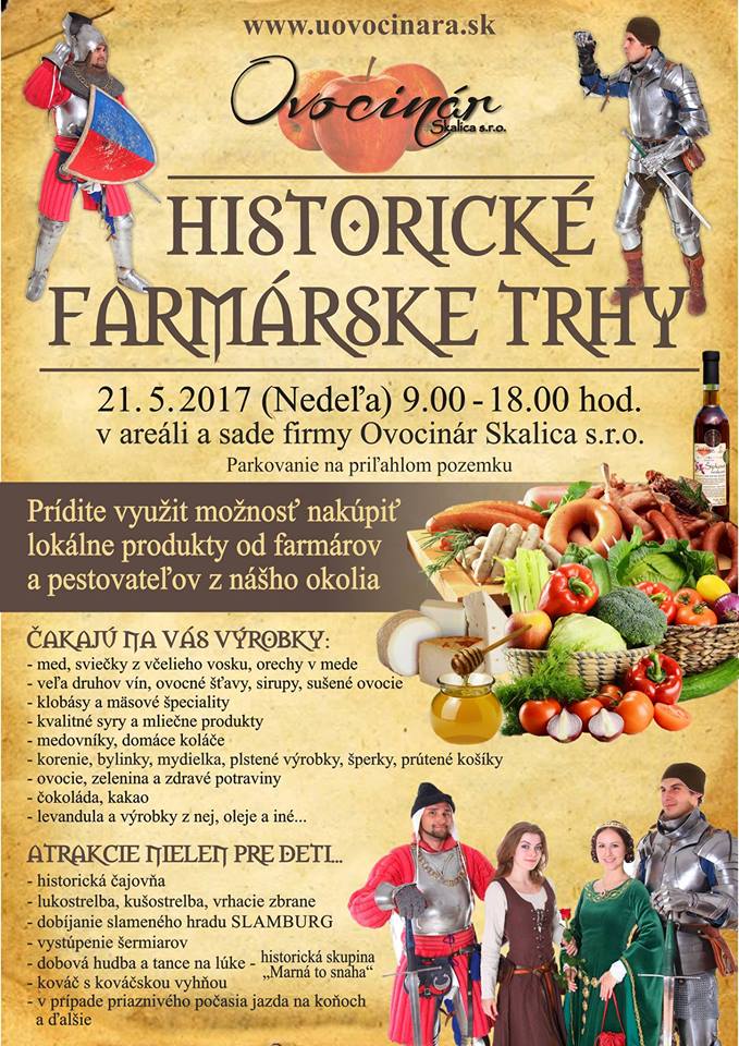 Pozývame Vás 21.5.2017 na Historické farmárske trhy v areáli Ovocinár Skalica s..r.o, . Pri príležitosti 800-tého výročia prvej písomnej zmienky o meste Skalica, sme sa rozhodli spraviť tieto farmárske trhy v historickom duchu.