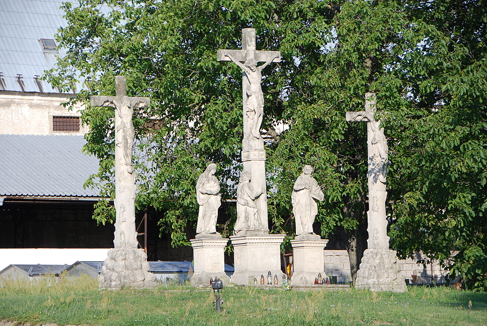 Je to socha modliaceho sa Ježiša na Olivovej hore (výška 114 cm) a socha plačúcej sv. Márie, ktorú podopiera sv. Ján (výška 167 cm). Sochy sú taktiež v životnej veľkosti a z pieskovca. Na žiadnej zo sôch kalvárie nie je uvedený autor. Celý súbor sôch však pripomína o pár rokov staršiu Kalváriu v Šaštíne a je predpoklad, že obidve vyšli z jednej kamenno-sochárskej dielne.