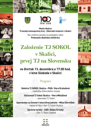 Mesto Skalica spolu so Záhorským múzeom v Skalici pozývajú na ďalší diel cyklu Putovanie skalickou históriou, ktorý je tento raz zameraný na Založenie TJ Sokol v Skalici, prvej TJ na Slovensku, ktorá tento rok oslávila sto rokov od svojho vzniku.