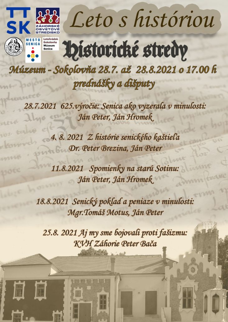 V mene organizátorov podujatia Vás srdečne pozývame na v poradí druhé stretnutie z cyklu historických stried s názvom „Leto s históriou“, ktoré sa uskutoční v stredu 4. augusta 2021 o 18:00 hodine v Múzeu Senica (v Sokolovni). Témou podujatia s názvom „Z histórie senického kaštieľa“ Vás budú sprevádzať historici PhDr. Peter Brezina a Ján Peter.
