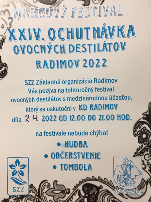 Už 24. ročník tradičnej koštovky, ochutnávky ovocných destilátov sa bude konať v Radimove. Opäť to bude v kultúrnom dome, v sobotu 2. apríla 2022 so začiatkom o 12.00