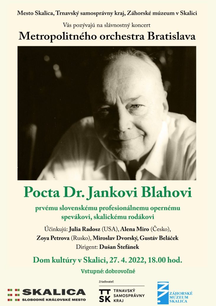 Slávnostný koncert Metropolitného orchestra Bratislava s dirigentom Dušanom Štefánkom a koncertným majstrom Petrom Uličným venovaný 120. výročiu narodenia a 40. výročiu úmrtia prvého slovenského profesionálneho operného speváka, skalického rodáka Dr. Janka Blaha sa po niekoľkých minuloročných preloženiach z objektívnych príčin uskutoční 27. apríla 2022 o 18.00 hod. v Dome kultúry v Skalici. V podaní popredných zahraničných a slovenských sólistov (Julia Radosz, Zoya Petrova, Miroslav Dvorský, Gustáv Beláček) zaznejú známe árie W. A. Mozarta, G. Pucciniho, A. Dvořáka, B. Smetanu, J. Offenbacha, F. Lehára, O. Nedbala a ďalších.