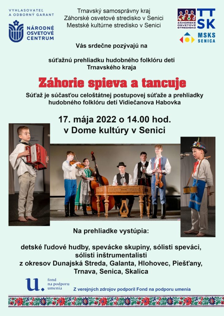 Trnavský samosprávny kraj, Záhorské osvetové stredisko v Senici a Mestské kultúrne stredisko v Senici vás srdečne pozývajú v utorok 17. mája 2022 o 14.00 hodine do Domu kultúry v Senici na Súťažnú prehliadku hudobného folklóru detí Trnavského kraja – Záhorie spieva a tancuje, ktorá je súčasťou celoštátnej postupovej súťaže a prehliadky hudobného folklóru detí s názvom „Vidiečanova Habovka“. Jej vyhlasovateľom a odborným garantom je Národné osvetové centrum v Bratislave.