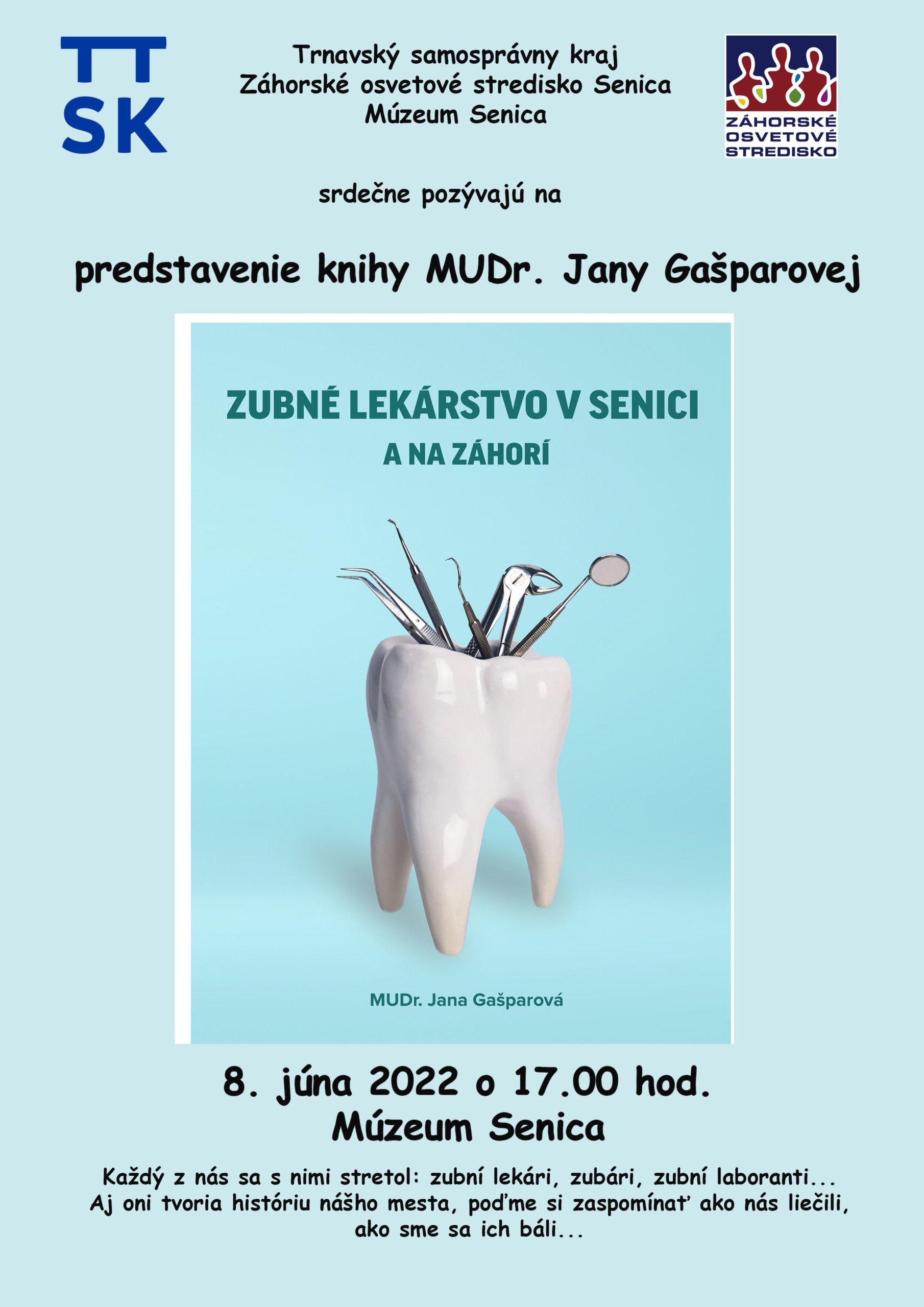 Trnavský samosprávny kraj, Záhorské osvetové stredisko v Senici v spolupráci s Múzeom Senica vás srdečne pozývajú v stredu 8. júna 2022 o 17.00 hodine do historických priestorov Múzea Senica na predstavenie knihy autorky MUDr. Jany Gašparovej s názvom „Zubné lekárstvo v Senici a na Záhorí“.