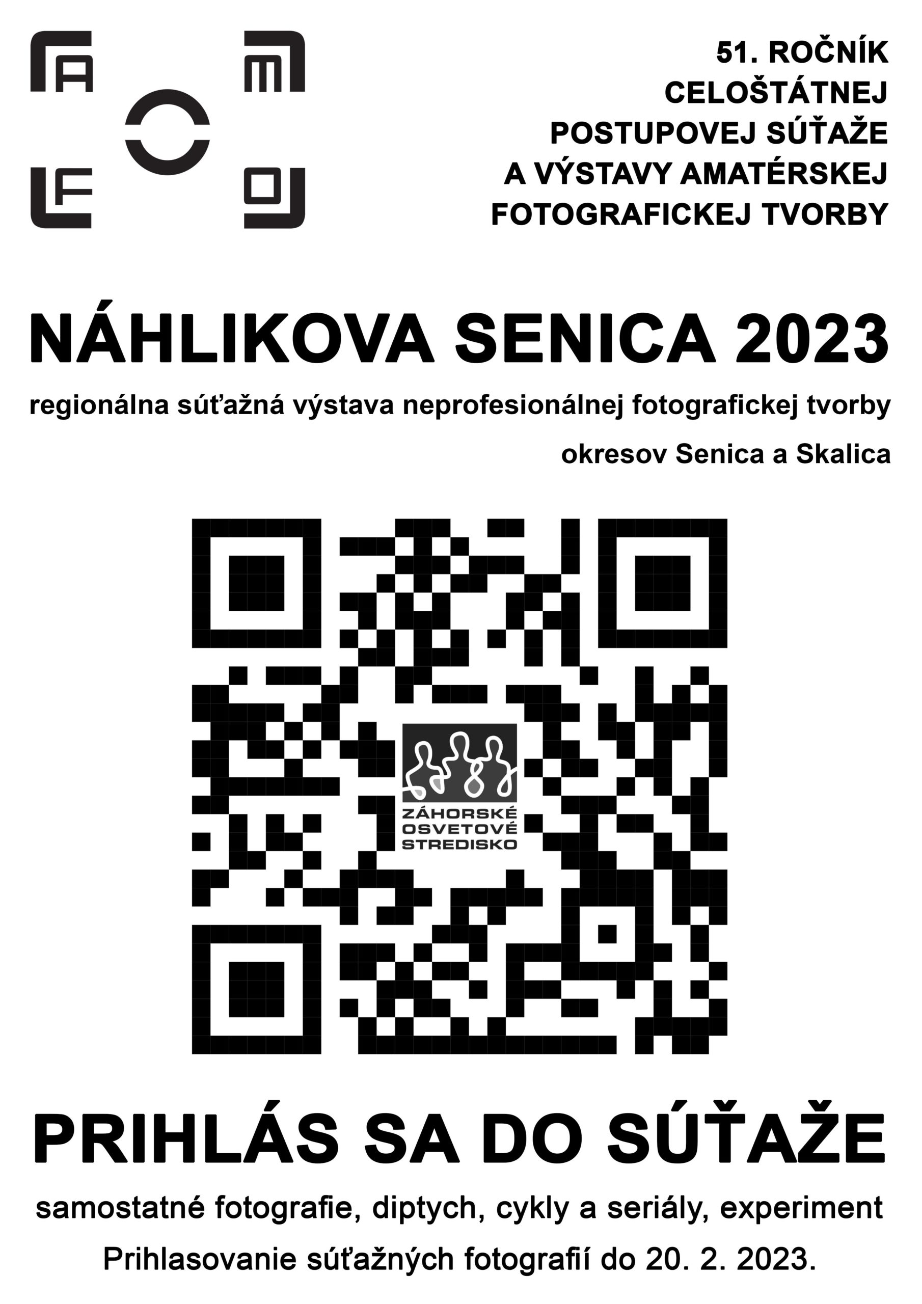 Do regionálnej súťaže amatérskej fotografickej tvorby Náhlikova Senica 2023 sa môžu prihlásiť neprofesionálni fotografi z okresov Senica a Skalica, prihlásením sa do súťaže cez elektronický formulár na webovej stránke vyhlasovateľa Národného osvetového centra v Bratislave https://www.nocka.sk/chcemsaprihlasit/prihlasenie. Prihlásiť sa a doručiť fotografické práce je potrebné do 20. februára 2023 do Záhorského osvetového strediska v Senici, ulica Vajanského 19/5. Výstava by sa mala uskutočniť v mesiaci marec roku 2023.