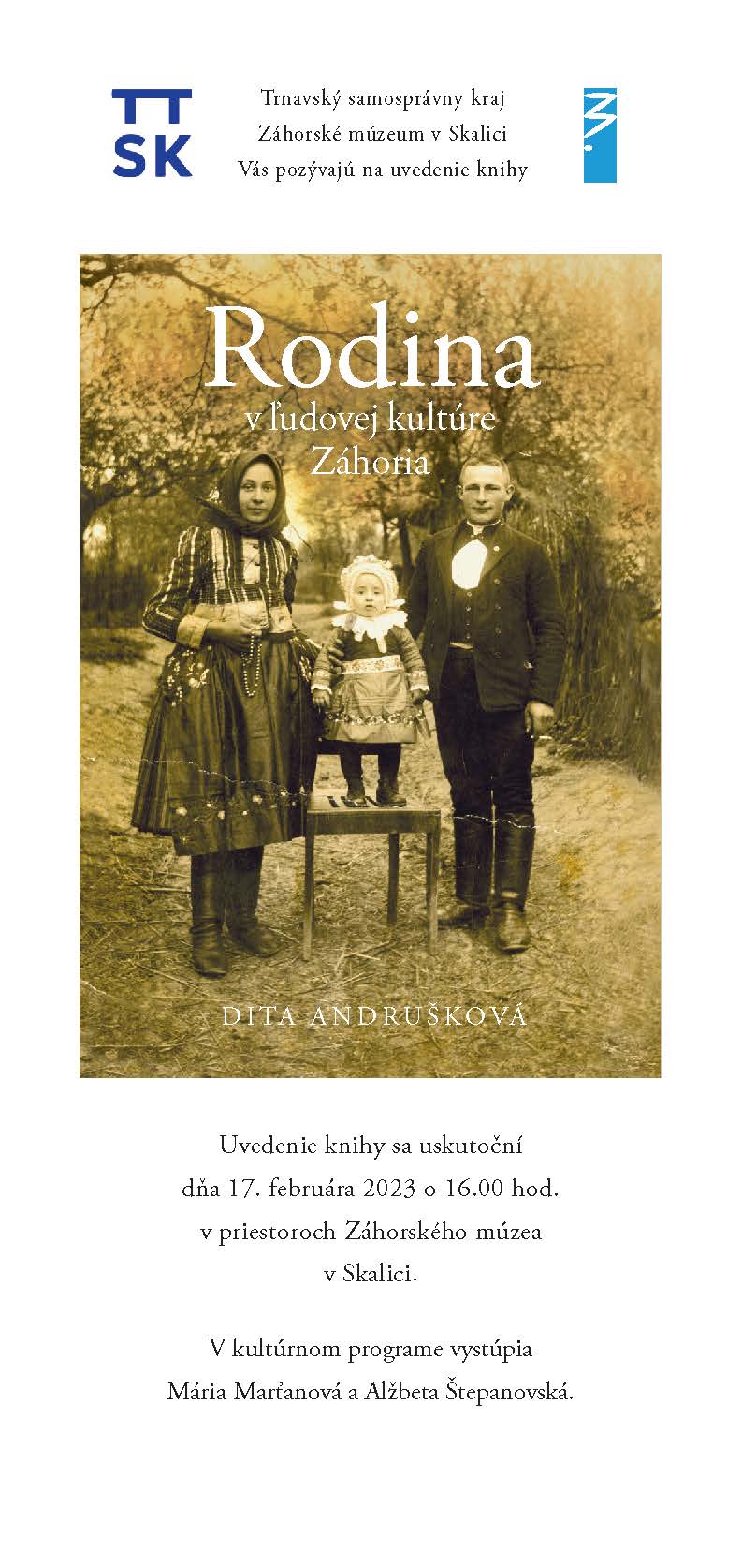 Záhorské múzeum v Skalici pripravilo novú odbornú monografiu s názvom Rodina v ľudovej kultúre Záhoria. Publikácia sa tematicky venuje rodinným zvykom v roľníckom prostredí, ktoré sú poňaté chronologicky (narodenie a detstvo, mladosť, svadobné zvyky, dospelosť, staroba, pohrebné obyčaje). Autorkou publikácie etnografického charakteru je etnologička a odborná pracovníčka múzea Dita Andrušková, autorom grafickej úpravy a dizajnu je grafik František Jablonovský. Bohatú obrazovú časť knihy tvoria dobové fotografie archívu múzea a vybraných zbierkových predmetov, doplnené materiálmi z ďalších archívov pamäťových inštitúcií a súkromných osôb z oblasti Záhoria a Myjavy z konca 19. storočia – 70. rokov 20. storočia. Obsahový základ monografie vychádza z výstavy a katalógu Rodina v tradičnej ľudovej kultúre Záhoria, sprístupnenej v múzeu na prelome rokov 2020 – 2021, ktorý autorka rozšírila o nové poznatky a fotografie.