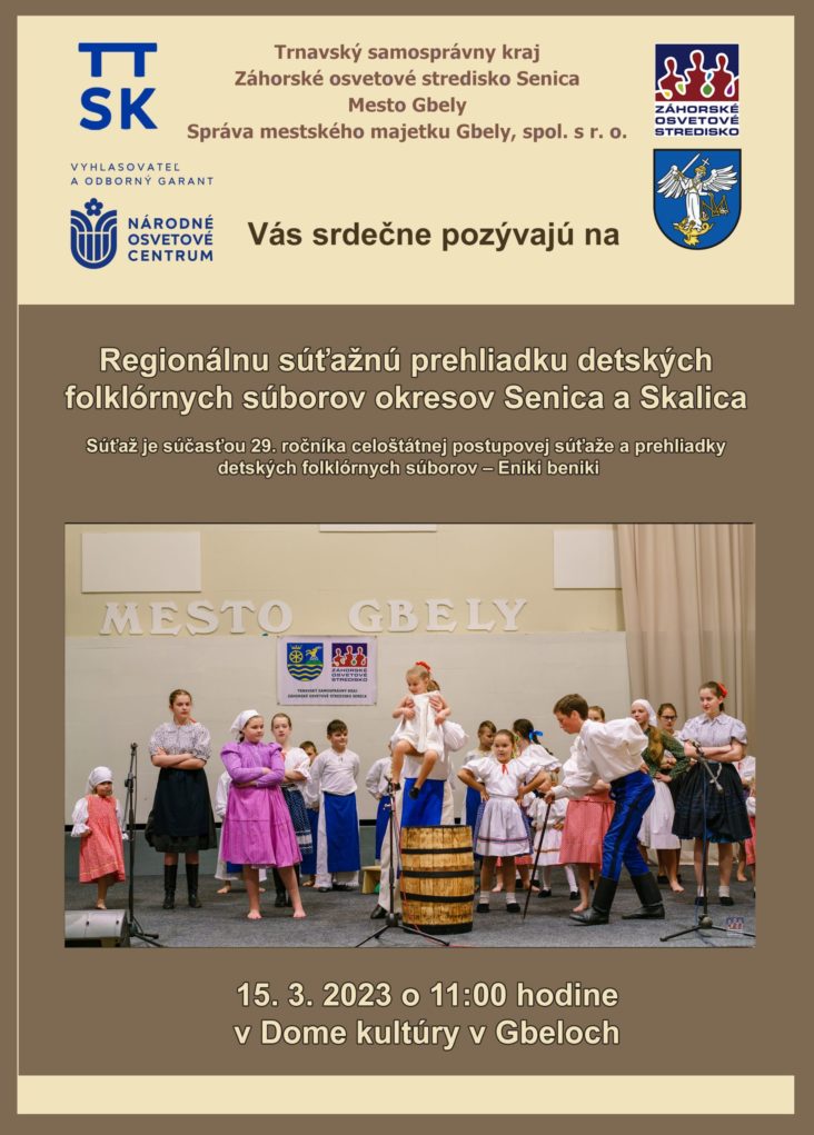 Trnavský samosprávny kraj, Záhorské osvetové stredisko v Senici, Mesto Gbely a Správa mestského majetku Gbely, spol. s r. o., vás srdečne pozývajú v stredu 15. marca 2023 o 11.00 hodine do Domu kultúry v Gbeloch na Regionálnu súťažnú prehliadku detských folklórnych súborov okresov Senica a Skalica, ktorá je súčasťou 29. ročníka celoštátnej postupovej súťaže a prehliadky detských folklórnych súborov s názvom „Eniki beniki“. Jej vyhlasovateľom, odborným garantom a hlavným finančným partnerom je Národné osvetové centrum v Bratislave z poverenia Ministerstva kultúry Slovenskej republiky.